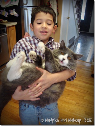 He’s not even 9 months old yet and already outweighs any cat I’ve ever had. To add to his bulk is a thick coat of long fur, which I’m sure will be a complete drag this summer while he sheds all over the house. He is very social and tolerant, and the cuddliest one of the bunch. We all still laugh at the tiny places he tries to nap in…